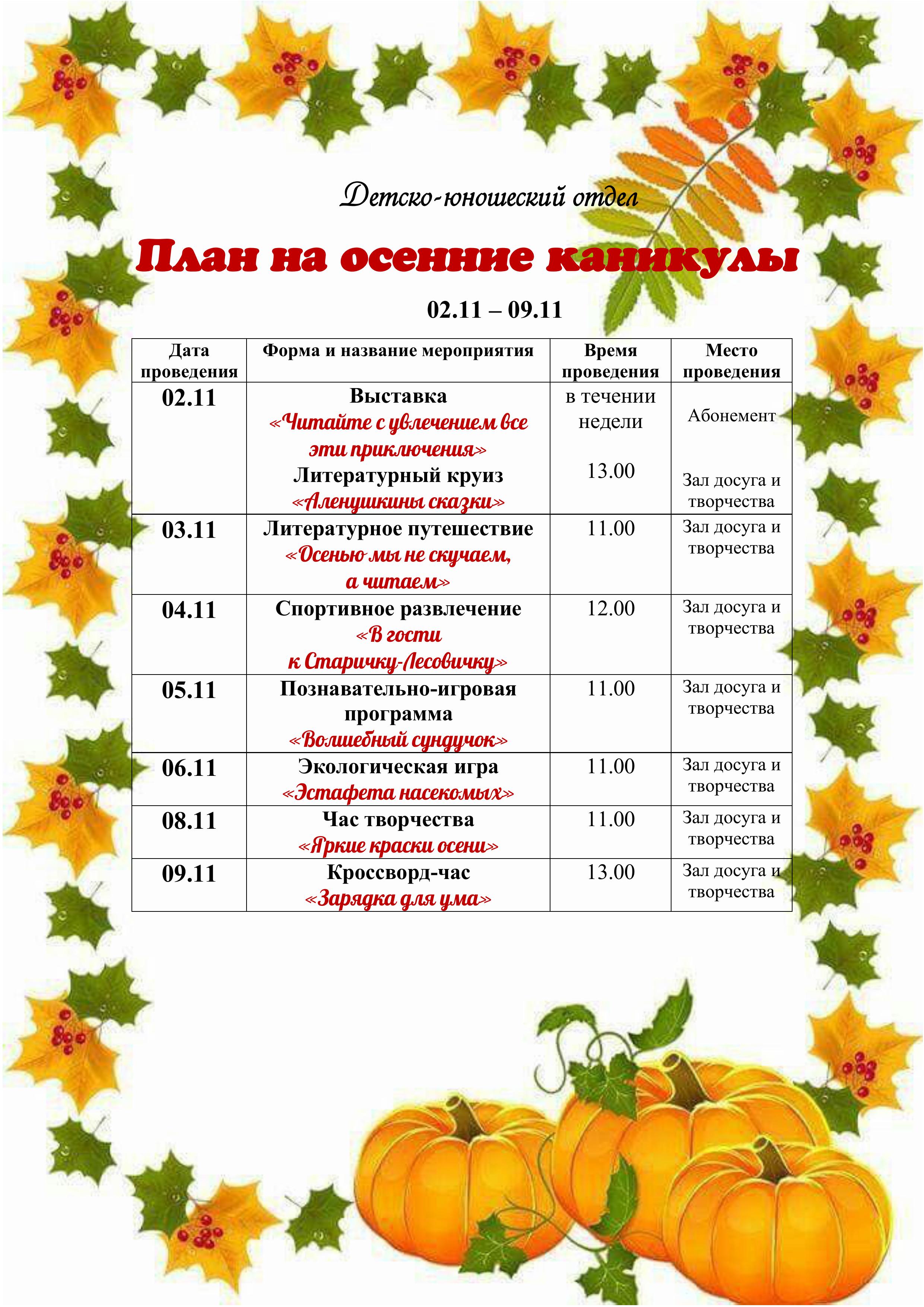 В период осенних каникул в Александрийской библиотеке прошло литературное путешествие «Библио-осень зовет». Ребята читали стихи, отгадывали осенние загадки, вспоминали осенние пословицы и поговорки, а также приняли участие в конкурсе рисунков «Золотая осень». К мероприятию была подготовлена тематическая выставка «Листопад осенних книг», на которой были представлены книги об этом замечательном и прекрасном времени года. |