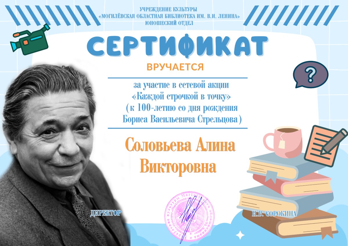 Филиал «Черноручская сельская библиотека» принял участие в сетевой акции «Каждой строчкой в точку», приуроченной к 100-летию со дня рождения Б. В. Стрельцова. По итогам акции библиотека отмечена сертификатом участника. |