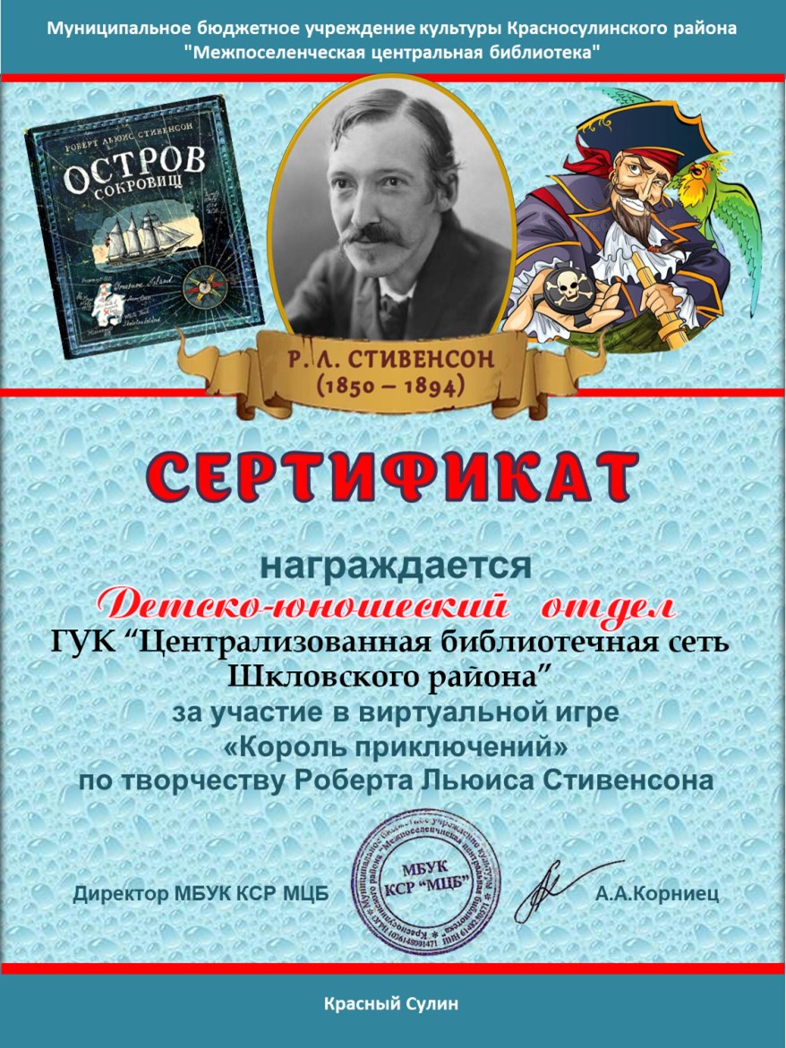 Шкловская центральная районная библиотека не оставила в стороне эту дату. Детско-юношеский отдел принял участие в виртуальной игре «Король приключений», организованной детским отделением Красносулинской межпоселенческой центральной библиотеки, где был отмечен сертификатом участника. |
