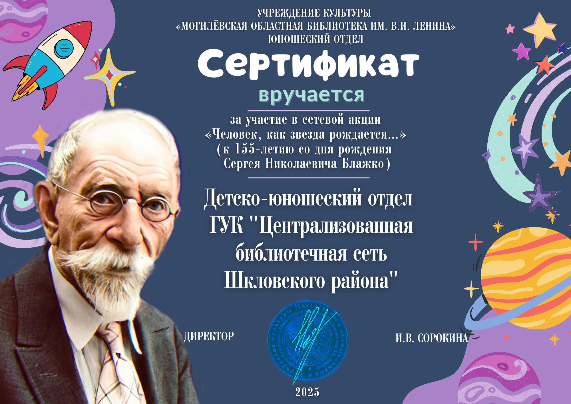 Детско-юношеский отдел присоединился к сетевой акции «Человек, как звезда рождается…», приуроченной к 155-летию со дня рождения ученого, астронома Сергея Николаевича Блажко. Организатором акции является юношеский отдел УК «Могилевская областная библиотека им. В.И. Ленина».