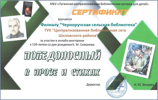 Юные читатели библиотеки приняли участие в громком чтении знаменитого стихотворения «Жди меня», ставшего символом верности и надежды в годы войны. Также они приняли участие в онлайн-викторине «Победоносный в прозе и стихах», посвященной 110-летию со дня рождения Константина Симонова, организованной МБУ «Луганская централизованная библиотечная система для детей», за что были отмечены сертификатом участника.