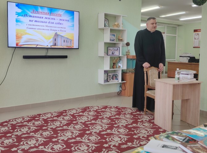 28 октября в читальном зале центральной библиотеки состоялась встреча под названием «Истинная жизнь – жизнь не только для себя» с настоятелем Михаилом костела Святых апостолов Петра и Павла. В своей духовной беседе настоятель Михаил уделил особое внимание духовной литературе и ее роли в жизни каждого человека. Настоятель костела передал в дар библиотеке книги духовного содержания и рассказал о важности чтения таких книг. В завершении встречи присутствующие получили ответы на все интересующие их вопросы. |