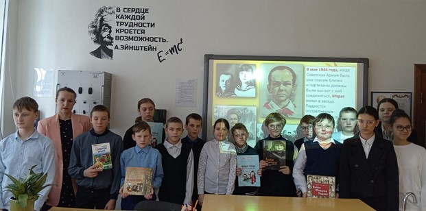 Библиотекари рассказали учащимся о Великой Отечественной войне, о том, что дети во время войны столкнулись лицом к лицу с жестокой, беспощадной, злой силой фашизма, которая стала тяжелым испытанием для советских людей. Также ребята просмотрели видеопрезентацию, из которой узнали о юных пионерах-героях – Марате Казее, Зине Портновой, Лене Голикове, Вале Котик и многих других, ставших рядом с отцами и своими старшими братьями в шеренги бойцов.